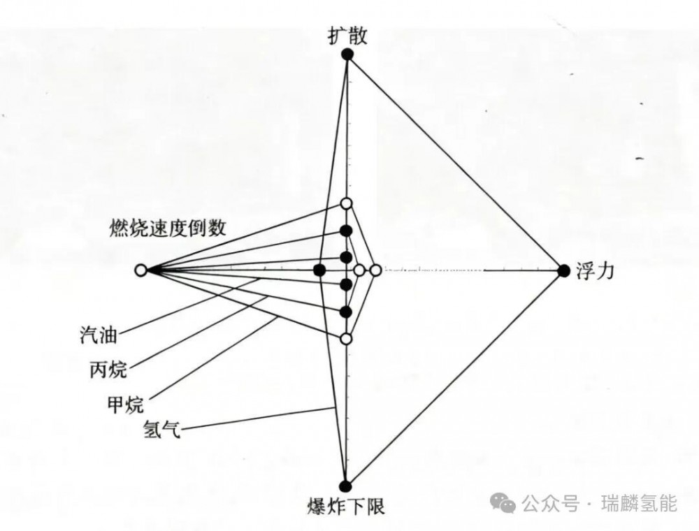 氫氣在擴散性、浮力和爆炸下限方面均優于天然氣、丙烷和汽油,表明其更不易形成可燃混合氣體。
