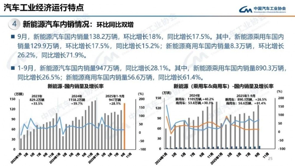 9月,新能源汽車產銷分別完成161.7萬輛和160.4萬輛,同比分別增長23.7%和24.6%,新能源汽車新車銷量達到汽車新車總銷量的49.7%。其中,氫燃料電池汽車產量為0.0441萬輛,同比增長173.9%;銷量為0.0408萬輛,同比增長94.3%。