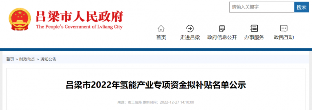 呂梁市人民政府近日公布了呂梁市2022年氫能產(chǎn)業(yè)專項(xiàng)資金擬補(bǔ)貼名單公示。