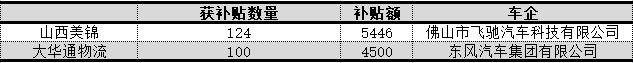 如圖表1所示,2022年呂梁市共有224輛氫能重卡獲得補(bǔ)貼,其中山西美錦新能源汽車制造有限公司124輛、山西大華通新能源物流有限公司100輛,兩家公司分別擬獲補(bǔ)貼5446萬(wàn)和4500萬(wàn)。其中山西美錦新能源汽車制造有限公司124輛對(duì)應(yīng)的車企均為飛馳汽車,山西大華通新能源物流有限公司的100輛則為東風(fēng)汽車。