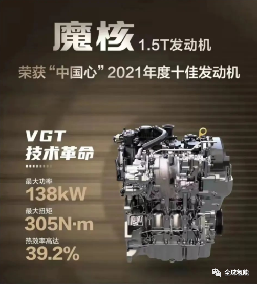 該氫內燃機基于榮獲“中國心”2021年度十佳發動機大獎的魔核1.5T發動機進一步優化而成,它主要采用了適應氫氣燃料的噴嘴及導軌、氫專用渦輪增壓器、氫專用機油、耐磨損耐氫的氣門與閥座等關鍵技術。在魔核發動機優異的性能基礎上進一步提升,熱效率目標達45%。