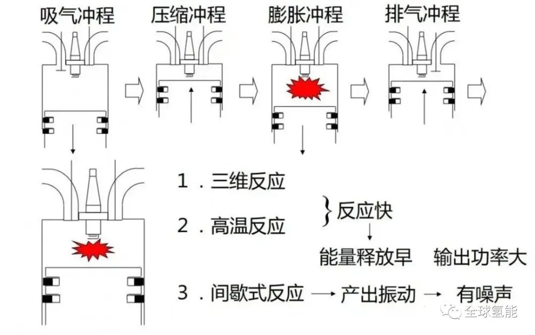 氫內燃機(hydrogen internal combustion engine),也叫氫燃料發動機,以傳統內燃機為基礎,通過改變燃料供應系統、噴射系統以及燃料等,燃燒氫氣產生動力,從而驅動車輛的行駛。可以簡單的理解為燒氫氣的發動機,其基本原理與普通的汽油或者柴油內燃機的原理一樣,是基本的汽缸—活塞式的內燃機,同樣是按照吸氣——壓縮——做功——排氣4個沖程來完成化學能對機械能的轉化,只是氫內燃機里的燃料是氫氣。