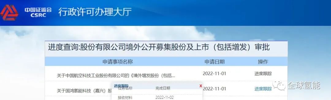 11月1日,國鴻氫能科技(嘉興)股份有限公司向中國證監(jiān)會國際部遞交《境外首次公開發(fā)行股份(包括普通股、優(yōu)先股等各類股票及股票的派生形式)審批》,2022年11月2日獲接收材料。