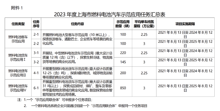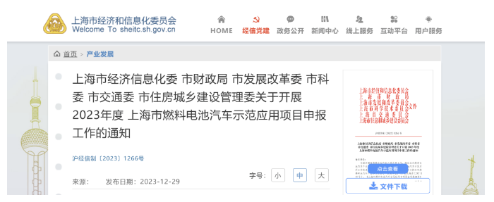 2023年12月29日,上海市經信委、財政局、發改委、科委、交通委、住建委聯合發布了關于開展2023年度上海市燃料電池汽車示范應用項目申報工作的通知。