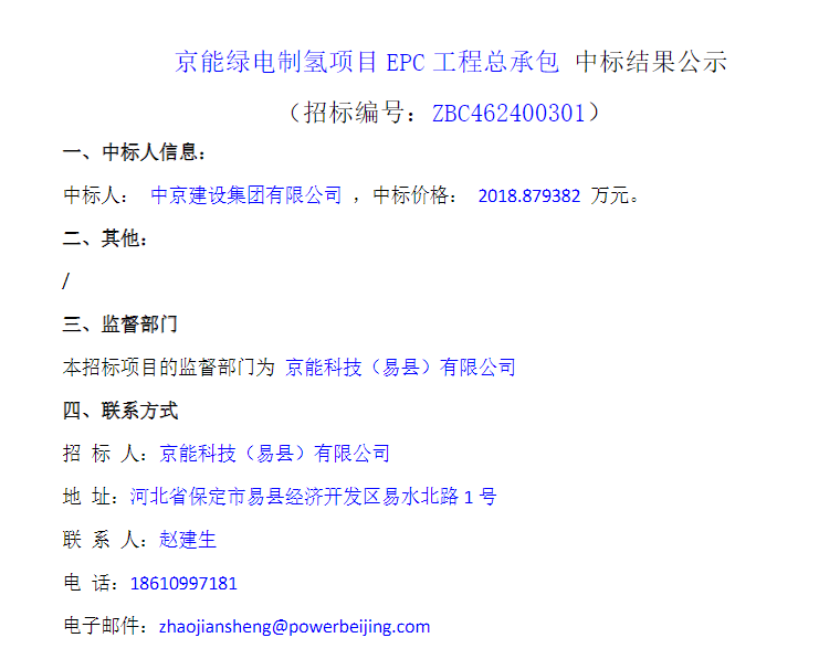 7月16日,京能綠電制氫項目EPC工程總承包中標結果公示。招標人為京能科技(易縣)有限公司。中標人為中京建設集團有限公司,中標價