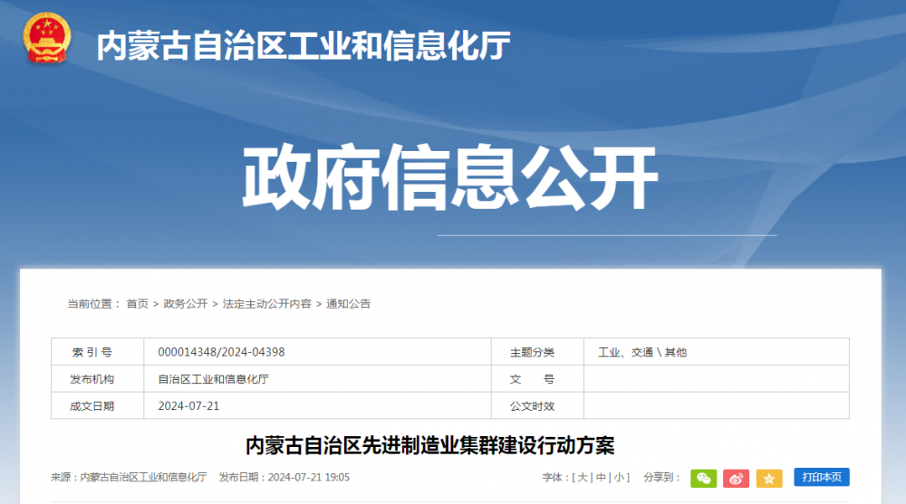 2024年7月21日,內蒙古工信廳官網發布《內蒙古自治區先進制造業集群建設行動方案》。