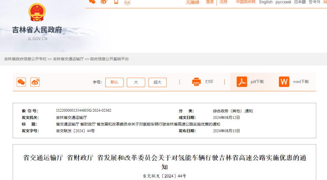 8月13日,吉林省交通運輸廳發布《關于對氫能車輛行駛吉林省高速公路實施優惠的通知》,《通知》指出:2024年9月1日0時至2026年8月31日24時,安裝ETC套裝設備的吉林省籍氫能車輛,在吉林省各高速公路收費站間點對點免費通行,相應的高速公路通行費由省財政統一支付。