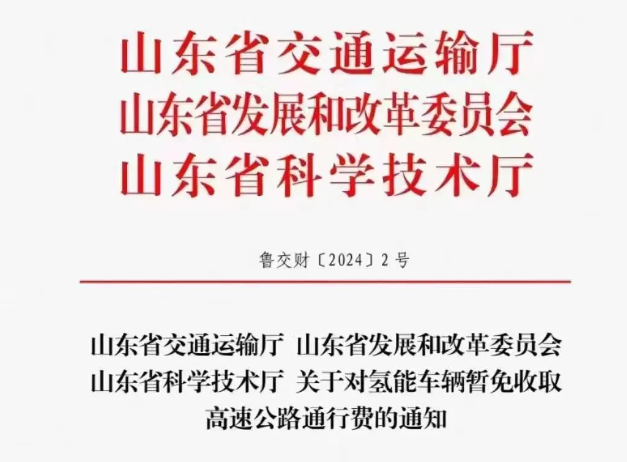 今年2月,山東省發布《關于對氫能車輛暫免收取高速公路通行費的通知》。自2024年3月1日起,對行駛在山東省高速公路且安裝ETC套裝設備的氫能車輛,暫免收取高速公路通行費。政策試行期2年,到期后依據執行情況適時調整。