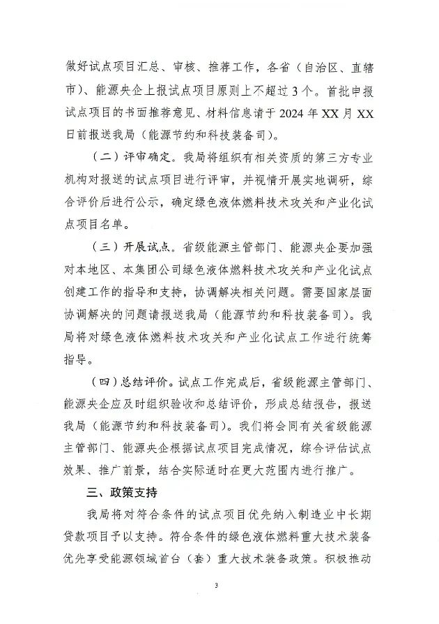 在政策支持方面,《通知》明確,將對符合條件的試點項目優先納入制造業中長期貸款項目予以支持。符合條件的綠色液體燃料重大技術裝備優先享受能源領域首臺(套)重大技術裝備政策。