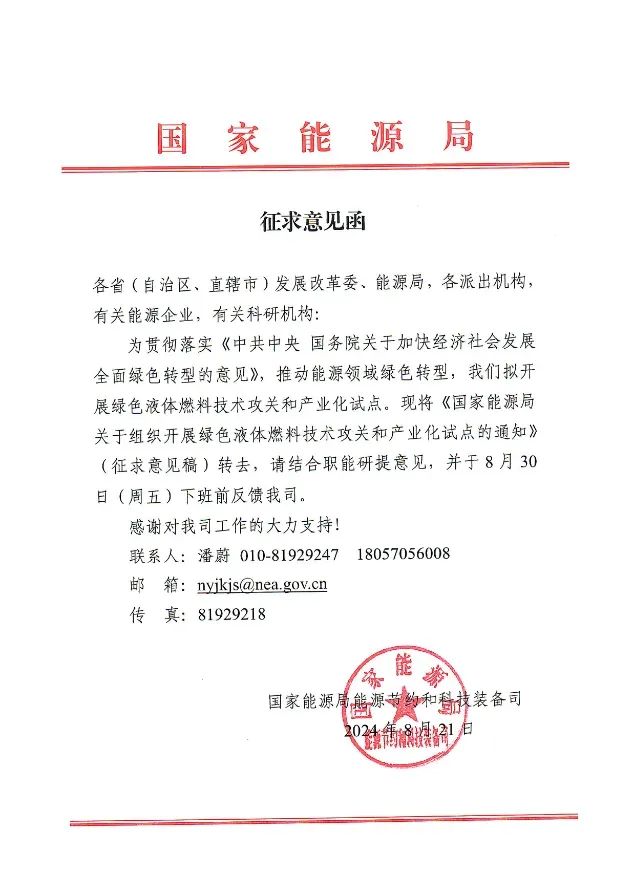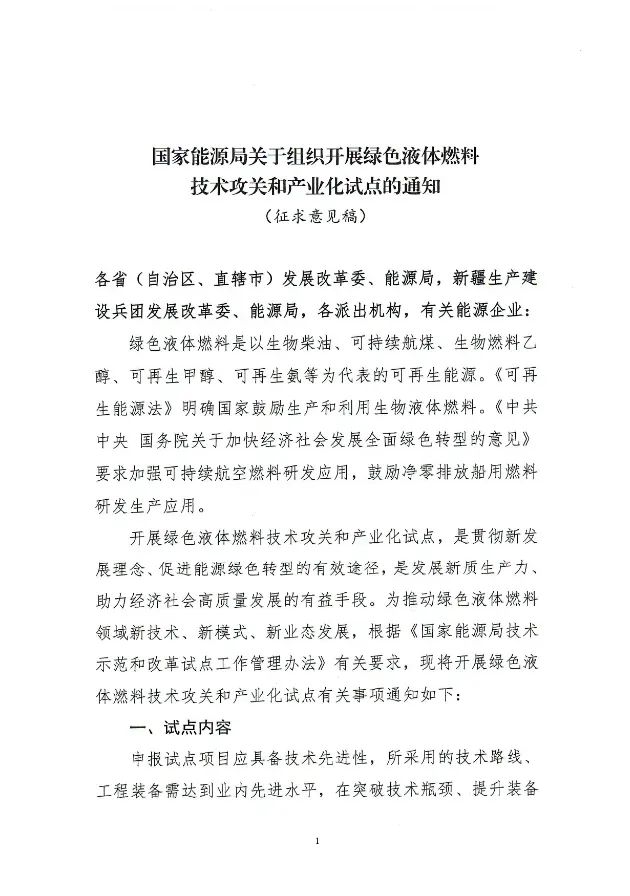 近日,國家能源局發布《關于組織開展綠色液體燃料技術攻關和產業化試點的通知》(征求意見稿),擬組織開展綠色液體燃料技術攻關和產業化試點。