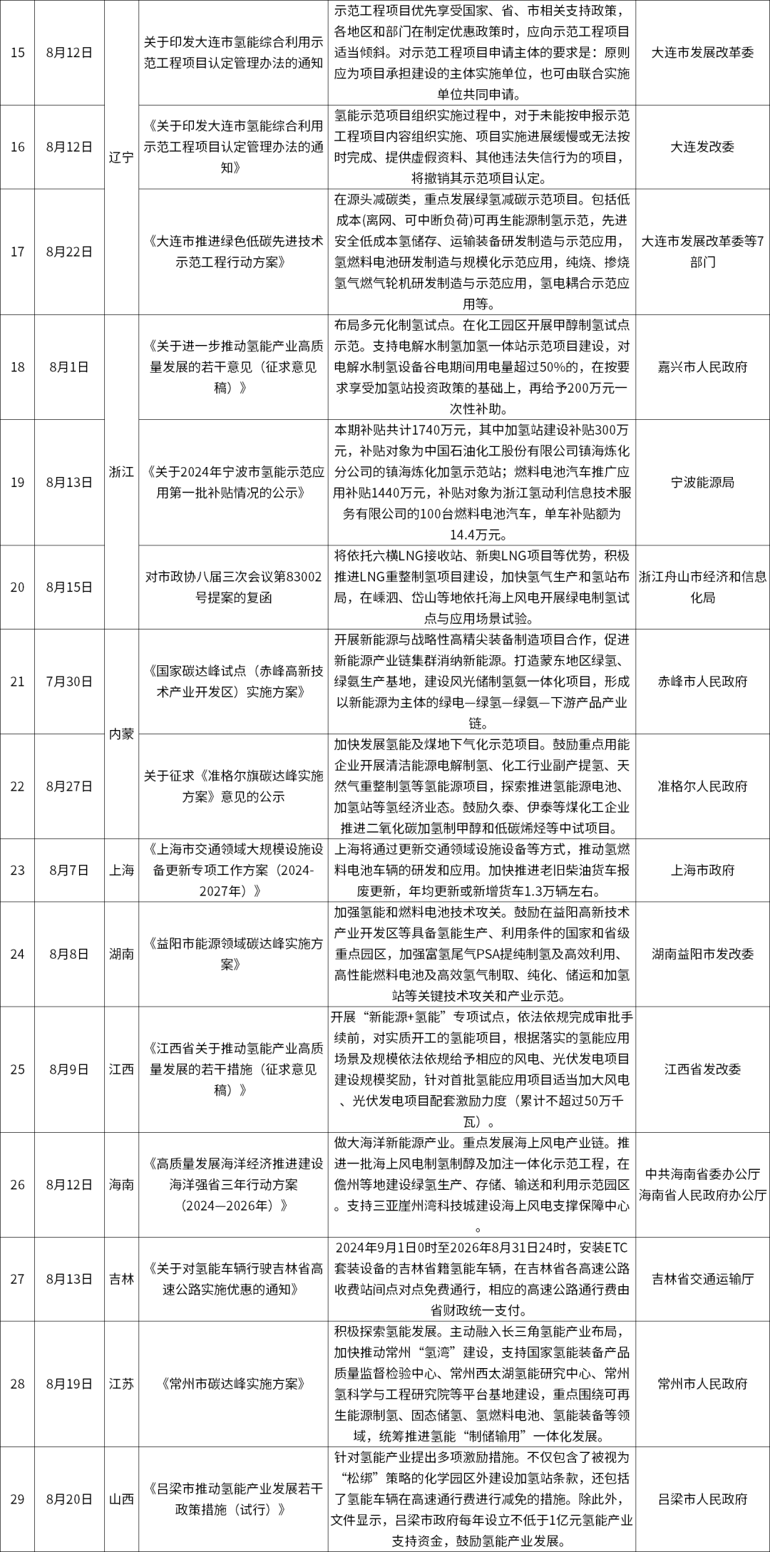 據氫能匯統計,2024年8月,我國發布了40條與氫能相關的政策,包括國家層面的11條,地方層面的29條。國家:氫能應用場景持續擴大氫能匯(微信公眾號:h2-2005)發現,今年8月,國家層面發布的政策中有11項涉及到氫能,這一數量是近些時間來的一個小“高峰”。