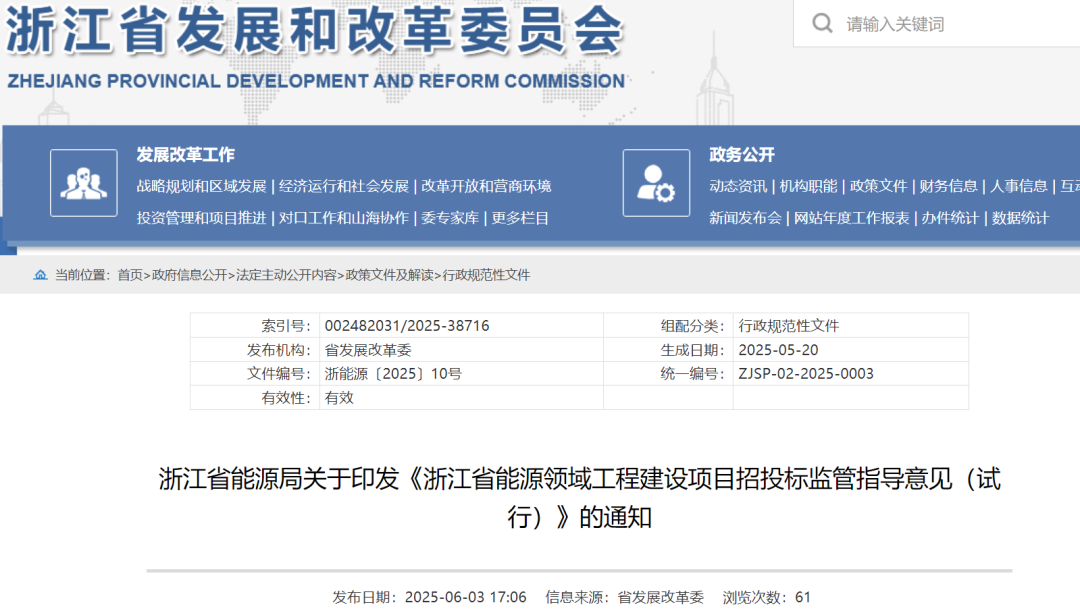 6月3日,浙江省發(fā)改委發(fā)布浙江省能源局關于印發(fā)《浙江省能源領域工程建設項目招投標監(jiān)管指導意見(試行)》的通知。