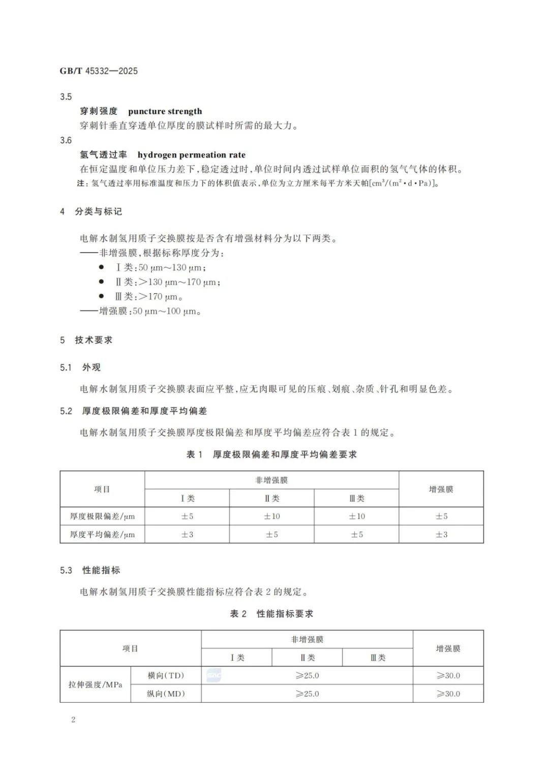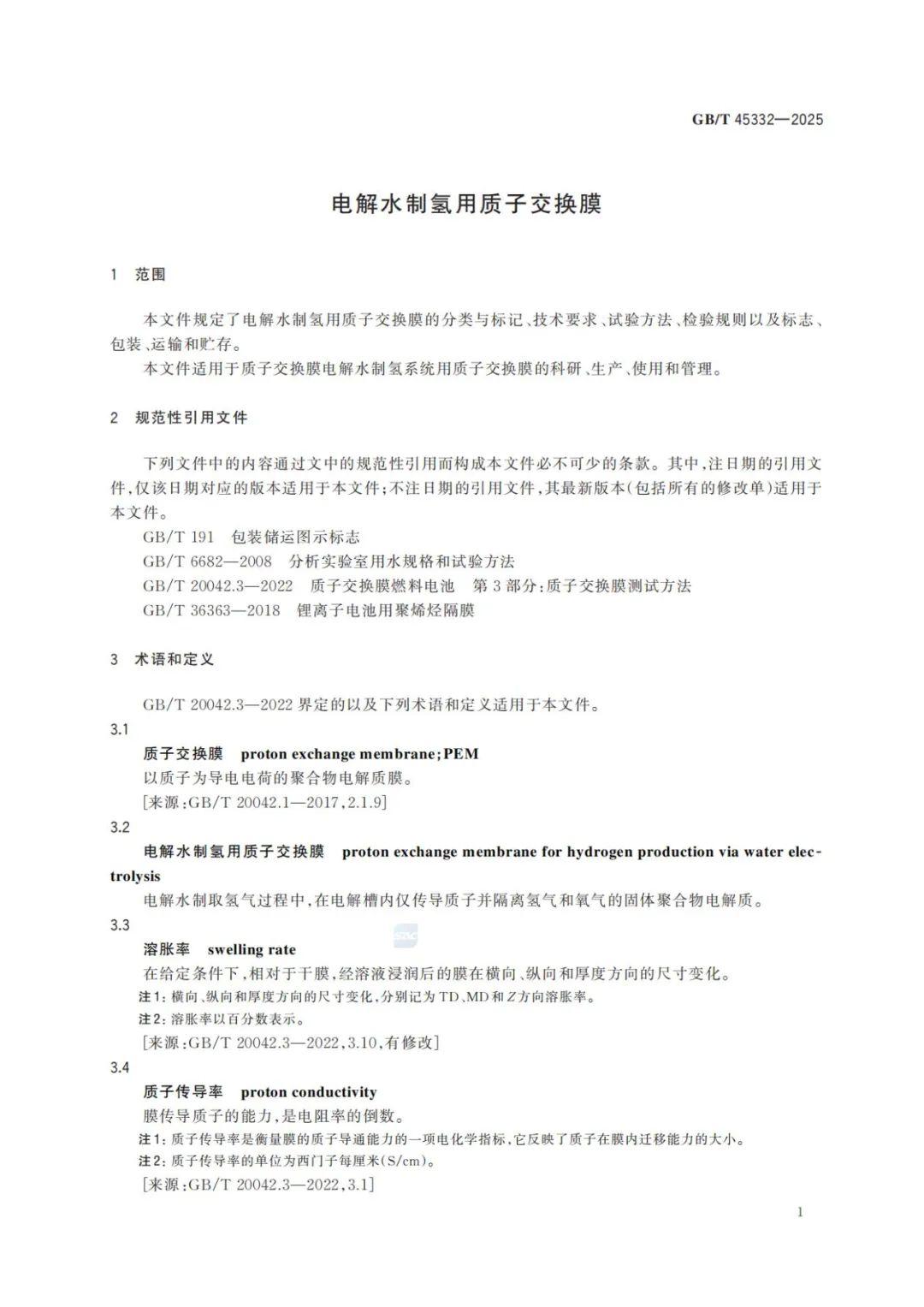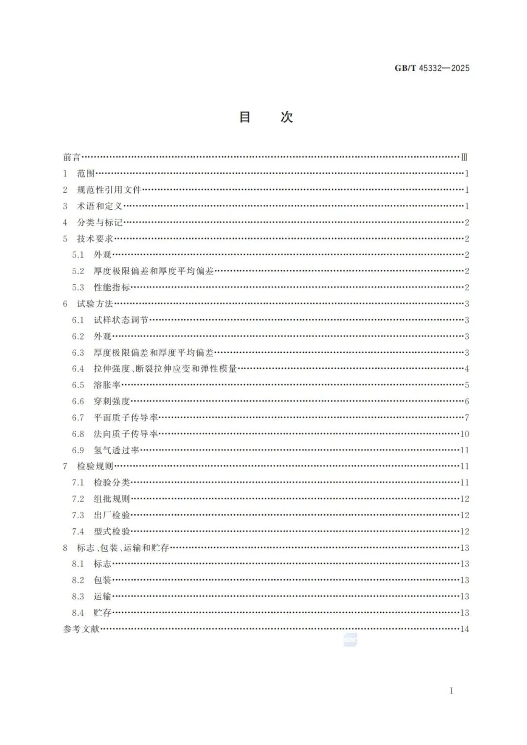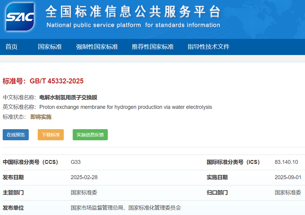 其中,一項為標準為《電解水制氫用質子交換膜》,該標準將于2025年9月1日起實施。
