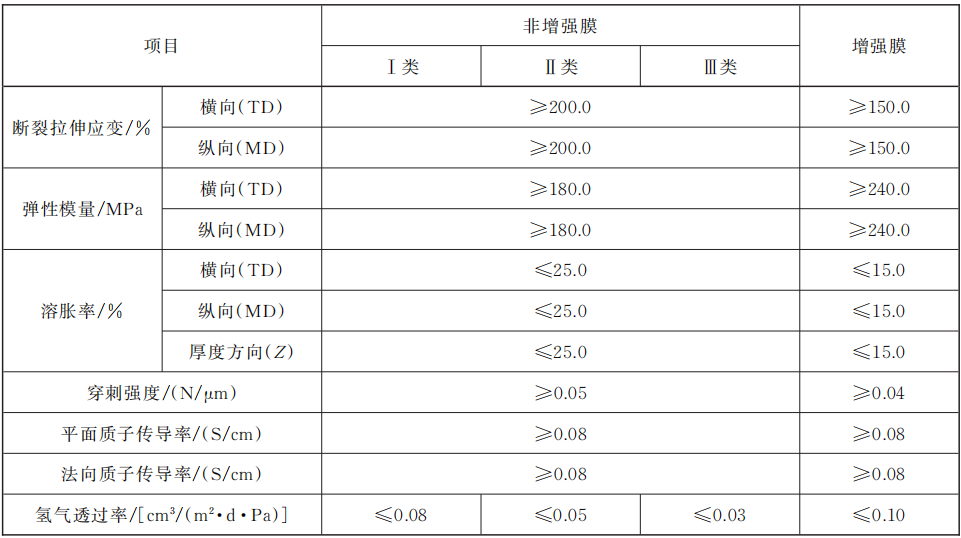 電解水制氫用質子交換膜性能指標應符合表2的規定。