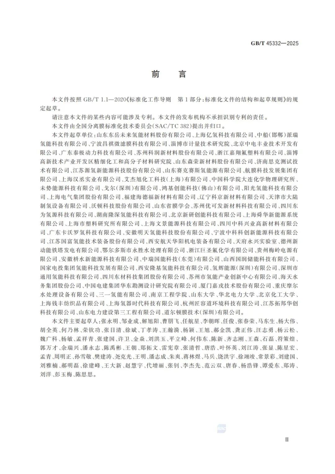 主要起草單位:山東東岳未來氫能材料股份有限公司、上海億氫科技有限公司、中船(邯鄲)派瑞氫能科技有限公司、寧波昌祺微濾膜科技有限公司、淄博市計量技術研究院、北京中電豐業技術開發有限公司、廣東泰極動力科技有限公司、蘇州科潤新材料股份有限公司、浙江嘉翔氟塑料有限公司、淄博高新技術產業開發區精細化工和高分子材料研究院、山東森榮新材料股份有限公司、濟南思克測試技術有限公司、江蘇源氫新能源科技股份有限公司、山東賽克賽斯氫能源有限公司、航膜科技發展集團有限公司、上海漢丞實業有限公司、艾杰旭化工科技(上海)有限公司、中國科學院大連化學物理研究所、未勢能源科技有限公司、戈爾(深圳)有限公司、鴻基創能科技(佛山)有限公司、陽光氫能科技有限公司、上海電氣集團股份有限公司、福建海德福新材料有限公司、遼寧科京新材料有限公司、天津市大陸制氫設備有限公司、沃頓科技股份有限公司、山東省膜學會、蘇州優可發新材料科技有限公司、四川東為氫源科技有限公司、湖南隆深氫能科技有限公司、北京新研創能科技有限公司、上海舜華新能源系統有限公司、上海市塑料研究所有限公司、上海文景能源科技有限公司、四川中科興業高新材料有限公司、廣東卡沃羅氫科技有限公司、安徽明天氫能科技股份有限公司、寧波中科科創新能源科技有限公司、江蘇國富氫能技術裝備股份有限公司、西安航天華陽機電裝備有限公司、天府永興實驗室、德州新動能鐵塔發電有限公司、鄂爾多斯市永勝水處理有限公司、浙江巨圣氟化學有限公司、貴州梅嶺電源有限公司、安徽枡水新能源科技有限公司、中瑞國能科技(東莞)有限公司 、山西國潤儲能科技有限公司、國家電投集團氫能科技發展有限公司、西安隆基氫能科技有限公司、氫輝能源(深圳)有限公司、深圳市通用氫能科技有限公司、四川東材科技集團股份有限公司、蘇州市氫能產業創新中心有限公司、海天水務集團股份公司、中國電建集團華東勘測設計研究院有限公司、廈門嘉戎技術股份有限公司、重慶摩爾水處理設備有限公司、三一氫能有限公司、南京工程學院、山東大學、華北電力大學、北京化工大學、上海錢豐紡織品有限公司、上海氫器時代科技有限公司、杭州匠容道環境科技有限公司、江蘇拓邦華創科技有限公司、山東電力建設第三工程有限公司、道爾頓膜技術(深圳)有限公司 。主要起草人 張永明、鄒業成、解旭陽、曹朋飛、任航星、李朝暉、任俊、張春榮、馬東生、楊大偉、胡全英、何乃林、榮欽功、張目清、徐斌、丁孝濤、王瀚漪、楊穎、王旭、郝金凱、龔正偉、汪志勇、楊云松、魏廣科、楊敏、孟祥青、張建國、許衛、金焱、劉洪玉、平立峰、何偉東、陳新、齊志剛、王森、石磊、符策煌、郭萬才、余瑞興、潘永志、陳禹彬、王朝、鄭拓文、雷憲章、張清哲、唐浩、葉懷英、劉江濤、張顯、陳星宏、孟青、周明正、孫雪敬、樊建濤、堯克光、王明、潘志成、朱爽、蔣林煜、馬兵、饒洪宇、徐翊竣、常景彩、劉建國、劉雅楠、郝明磊、徐建峰、王大新、趙慧宇、代增麗、張釗、李杰先、范云雙、唐春、楊浩鋒、譚愛東、鄭濤、劉洋、彭玉梅、陳思思 。