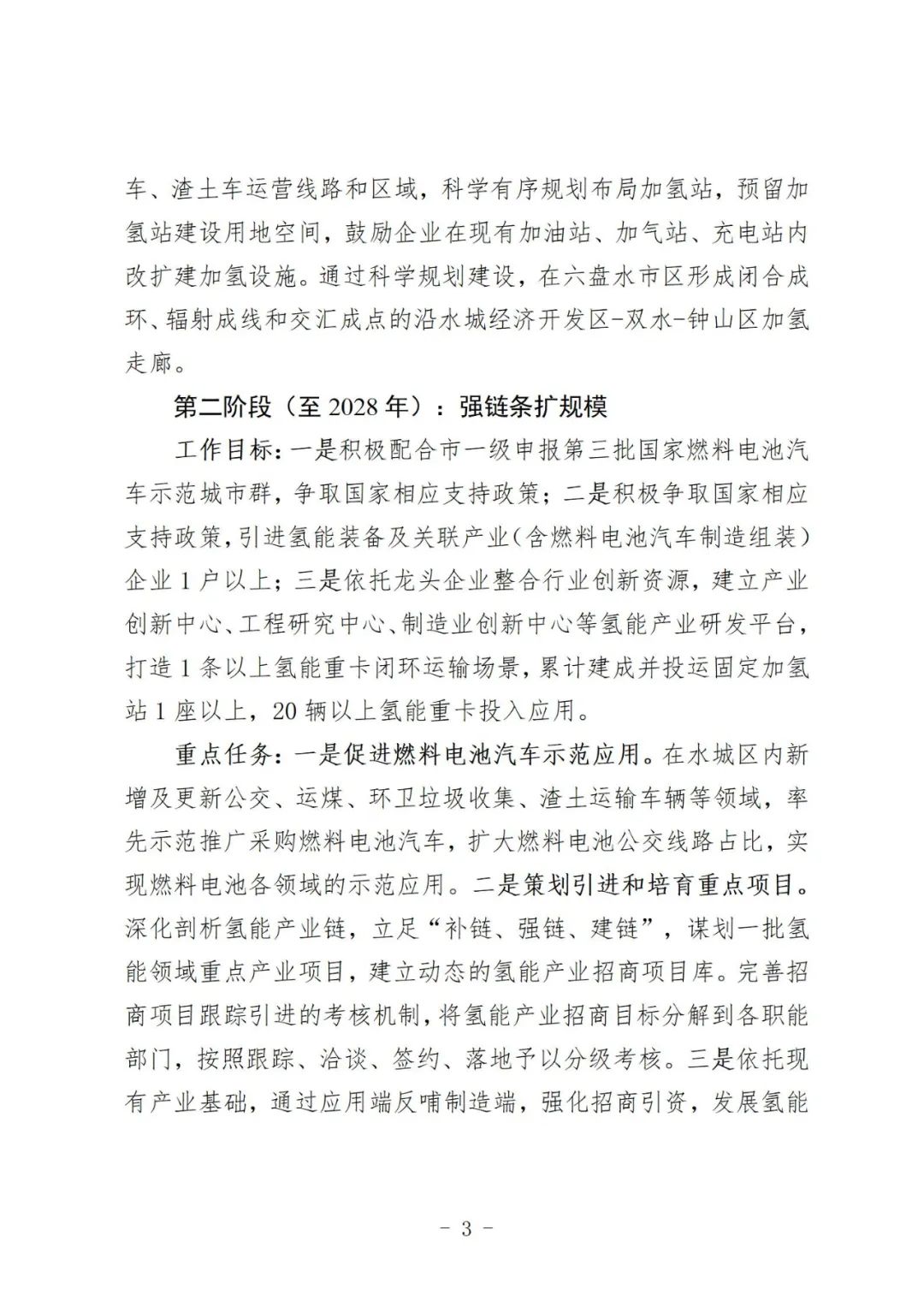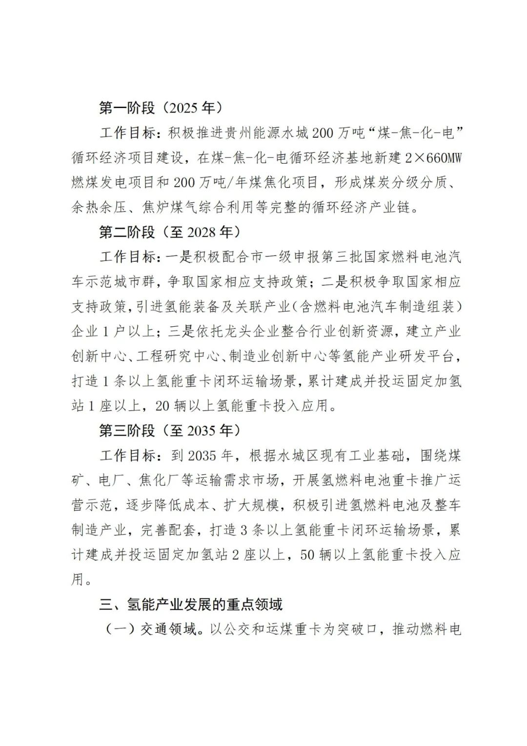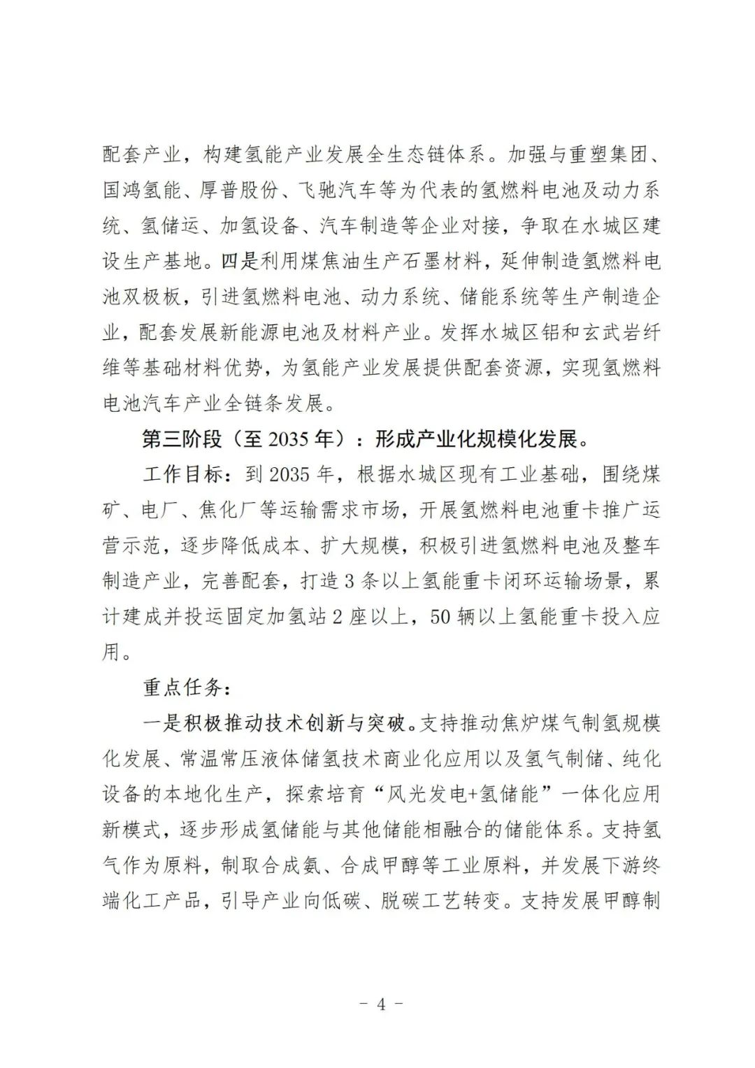 工作目標:到2035年,根據(jù)水城區(qū)現(xiàn)有工業(yè)基礎,圍繞煤礦、電廠、焦化廠等運輸需求市場,開展氫燃料電池重卡推廣運營示范,逐步降低成本、擴大規(guī)模,積極引進氫燃料電池及整車制造產(chǎn)業(yè),完善配套,打造3條以上氫能重卡閉環(huán)運輸場景,累計建成并投運固定加氫站2座以上,50輛以上氫能重卡投入應用。