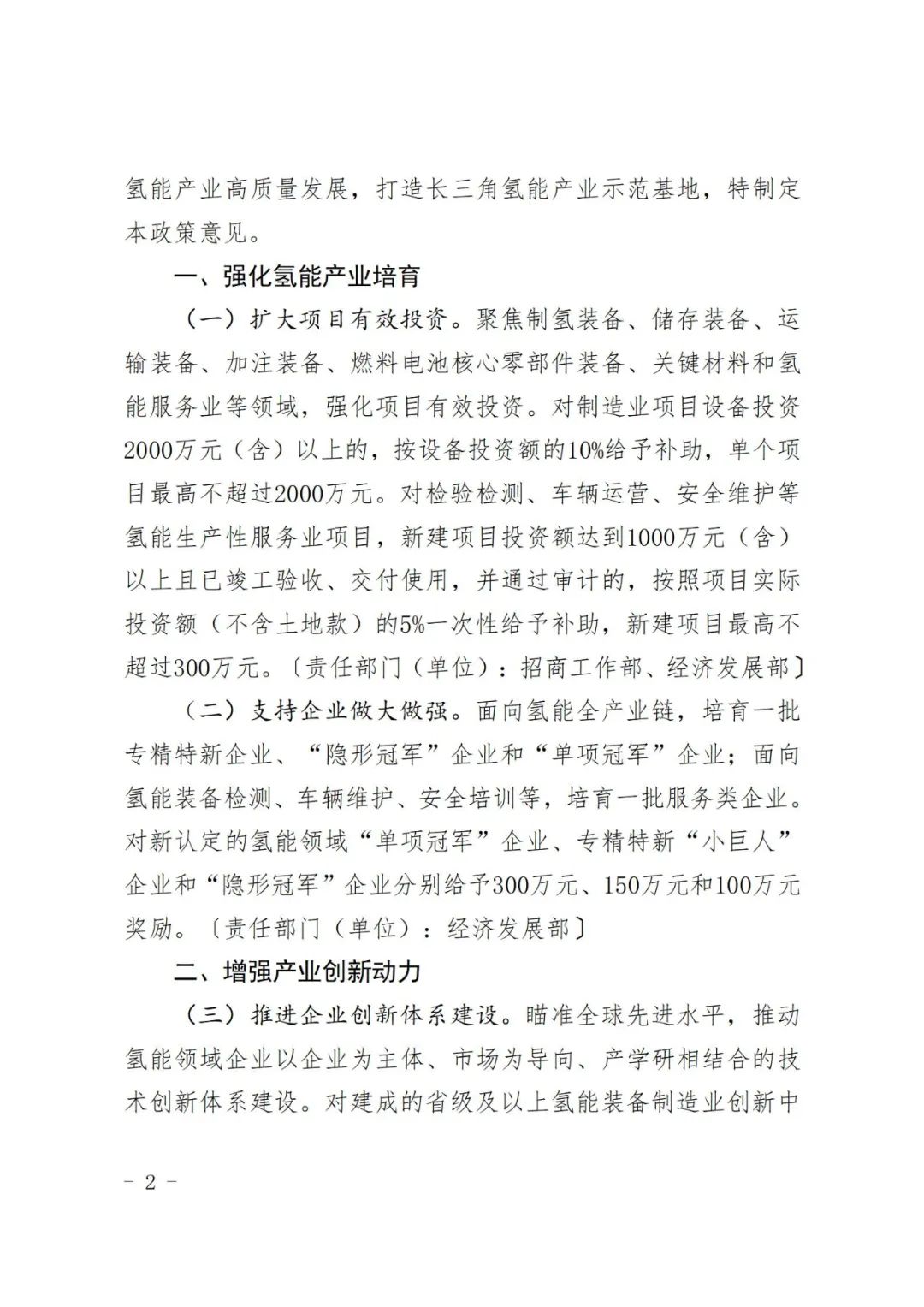 文件指出,聚焦制氫裝備、儲存裝備、運輸裝備、加注裝備、燃料電池核心零部件裝備、關鍵材料和氫能服務業等領域,強化項目有效投資。對制造業項目設備投資2000萬元(含)以上的,按設備投資額的10%給予補助,單個項目最高不超過2000萬元。對檢驗檢測、車輛運營、安全維護等氫能生產性服務業項目,新建項目投資額達到1000萬元(含)以上且已竣工驗收、交付使用,并通過審計的,按照項目實際投資額(不含土地款)的5%一次性給予補助,新建項目最高不超過300萬元。