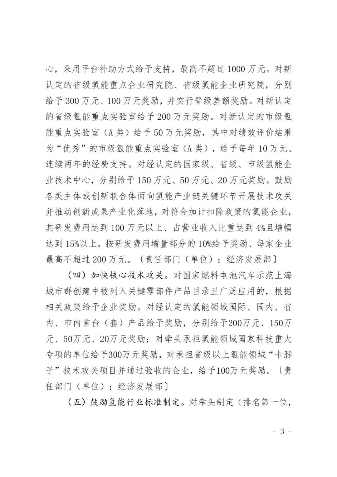 面向氫能全產業鏈,培育一批專精特新企業、“隱形冠軍”企業和“單項冠軍”企業;面向氫能裝備檢測、車輛維護、安全培訓等,培育一批服務類企業。對新認定的氫能領域“單項冠軍”企業、專精特新“小巨人”企業和“隱形冠軍”企業分別給予300萬元、150萬元和100萬元獎勵。