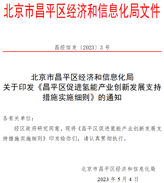 根據《昌平區促進氫能產業創新發展支持措施實施細則》(昌經信發〔2023〕3號)文件。
