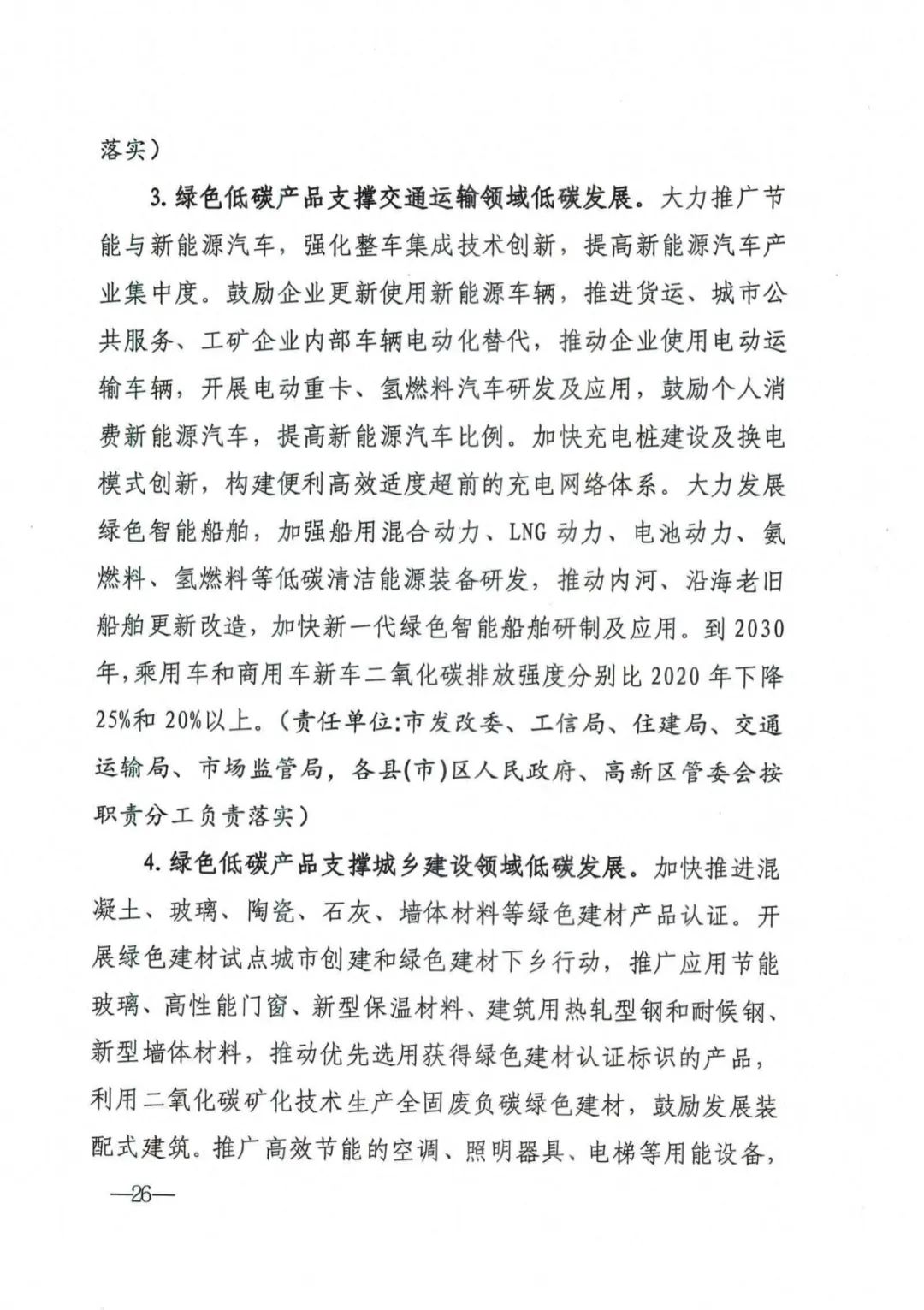 綠色低碳產品支撐交通運輸領域低碳發展。大力推廣節能與新能源汽車,強化整車集成技術創新,提高新能源汽車產業集中度。鼓勵企業更新使用新能源車輛,推進貨運、城市公共服務、工礦企業內部車輛電動化替代,推動企業使用電動運輸車輛,開展電動重卡、氫燃料汽車研發及應用,鼓勵個人消費新能源汽車,提高新能源汽車比例。加快充電樁建設及換電模式創新,構建便利高效適度超前的充電網絡體系。大力發展綠色智能船舶,加強船用混合動力、LNG動力、電池動力、氨燃料、氫燃料等低碳清潔能源裝備研發,推動內河、沿海老舊船舶更新改造,加快新一代綠色智能船舶研制及應用。