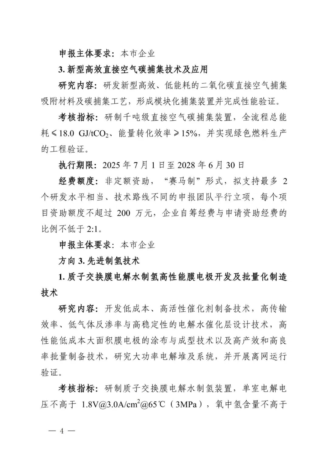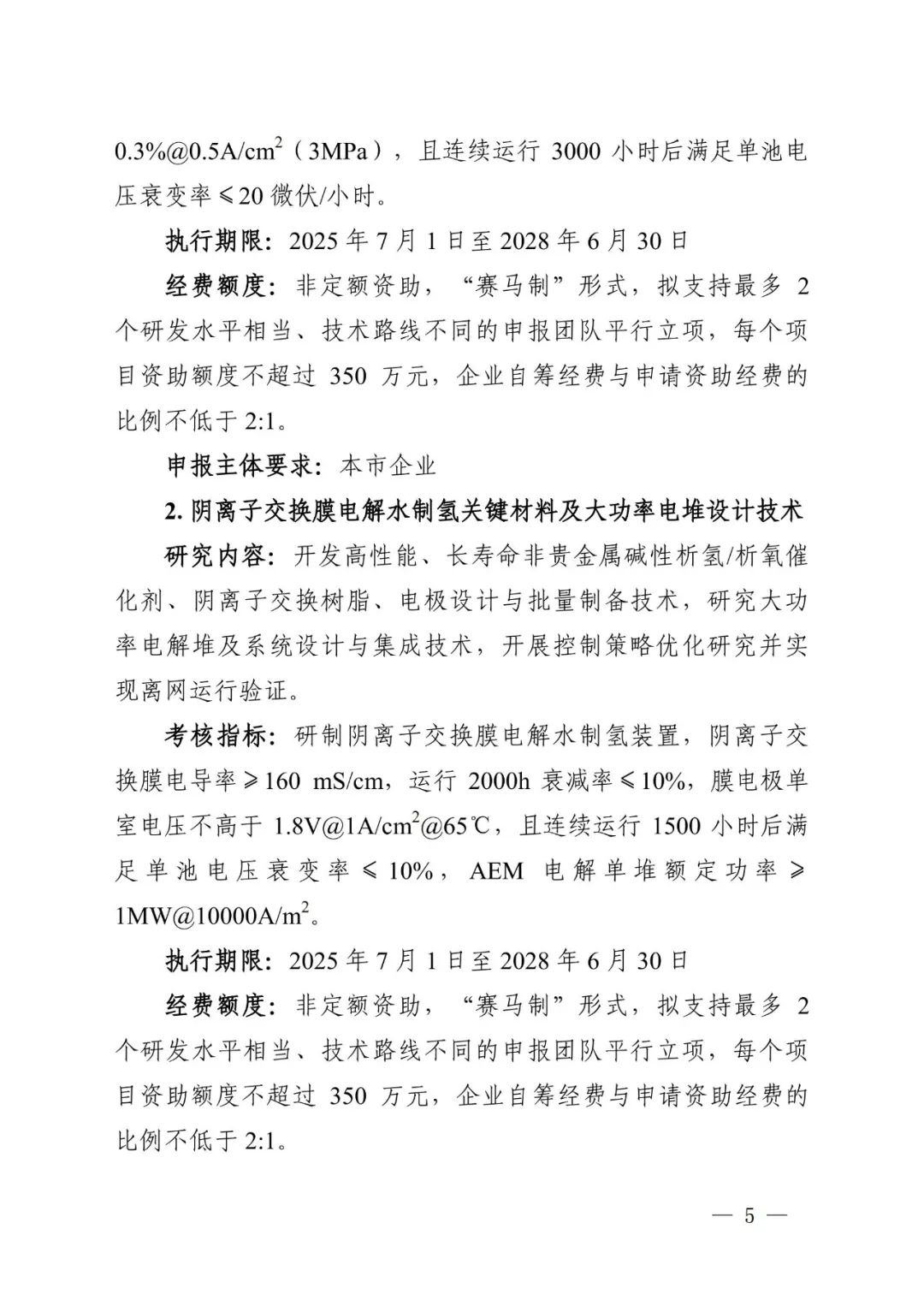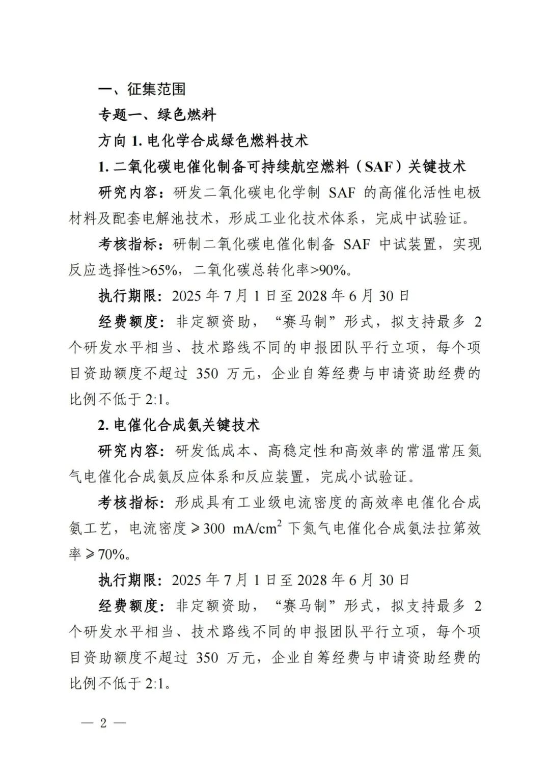 其中,二氧化碳電催化制備可持續(xù)航空燃料(SAF)關(guān)鍵技術(shù)、電催化合成氨關(guān)鍵技術(shù)、質(zhì)子交換膜電解水制氫高性能膜電極開發(fā)及批量化制造技術(shù)、陰離子交換膜電解水制氫關(guān)鍵材料及大功率電堆設(shè)計技術(shù)、高功率高能量密度燃料電池小堆系統(tǒng)技術(shù)及應(yīng)用,每個項目資助額度不超過350萬元。