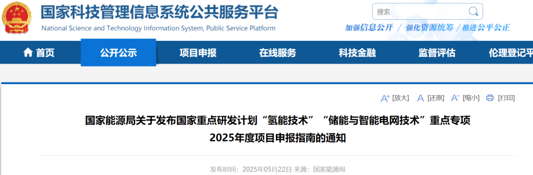 5月22日,國家科技管理信息系統公共服務平臺發布《國家能源局關于發布國家重點研發計劃“氫能技術”“儲能與智能電網技術”重點專項2025年度項目申報指南的通知》。