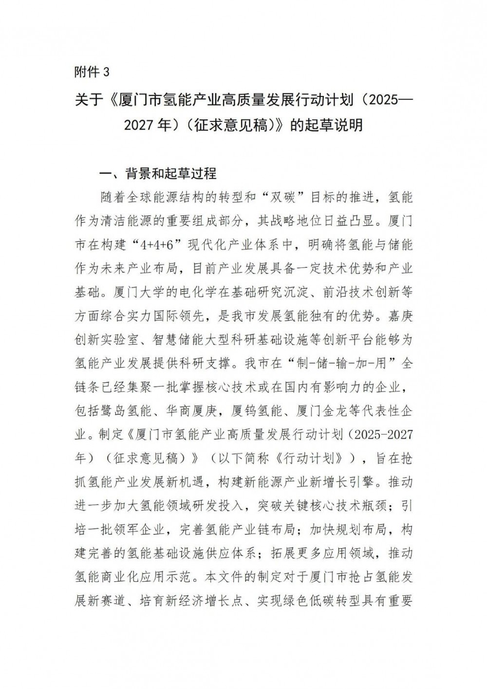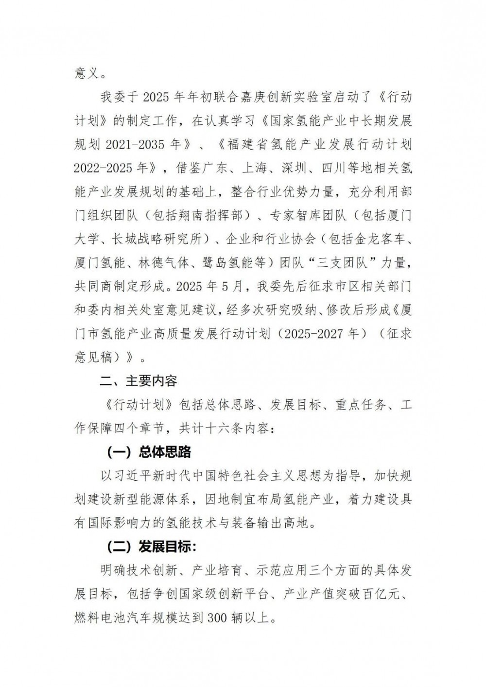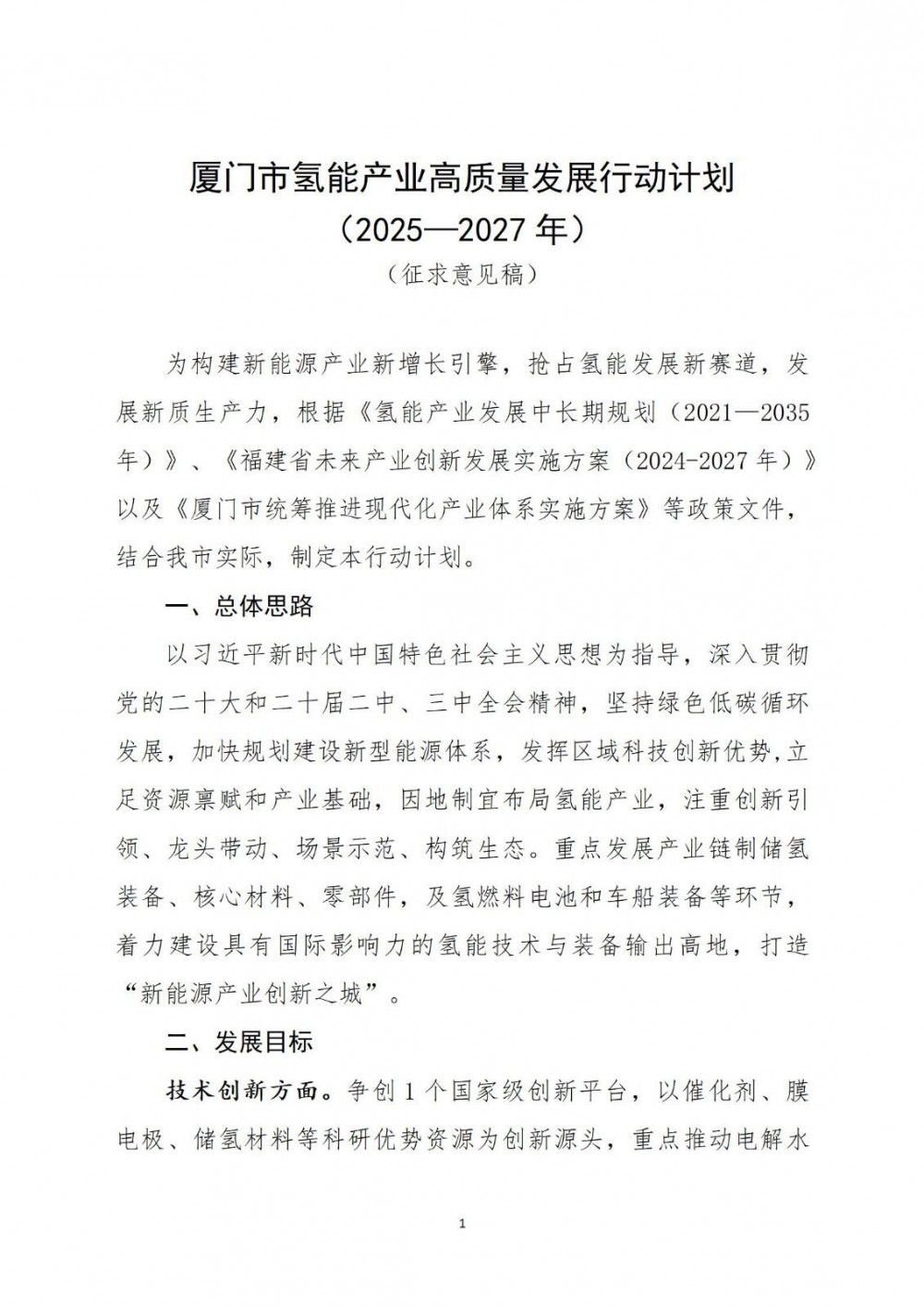 為搶抓氫能產業發展新機遇,構建新能源產業新增長引擎,實現能源綠色低碳轉型,現將《廈門市氫能產業高質量發展行動計劃(2025—2027年)(征求意見稿)》向社會公開征求意見。