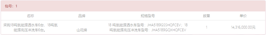 根據招標公告,采購18噸氫能源灑水車6臺,18噸氫能源高壓沖洗車6臺。最高限價總計:14,340,000元。