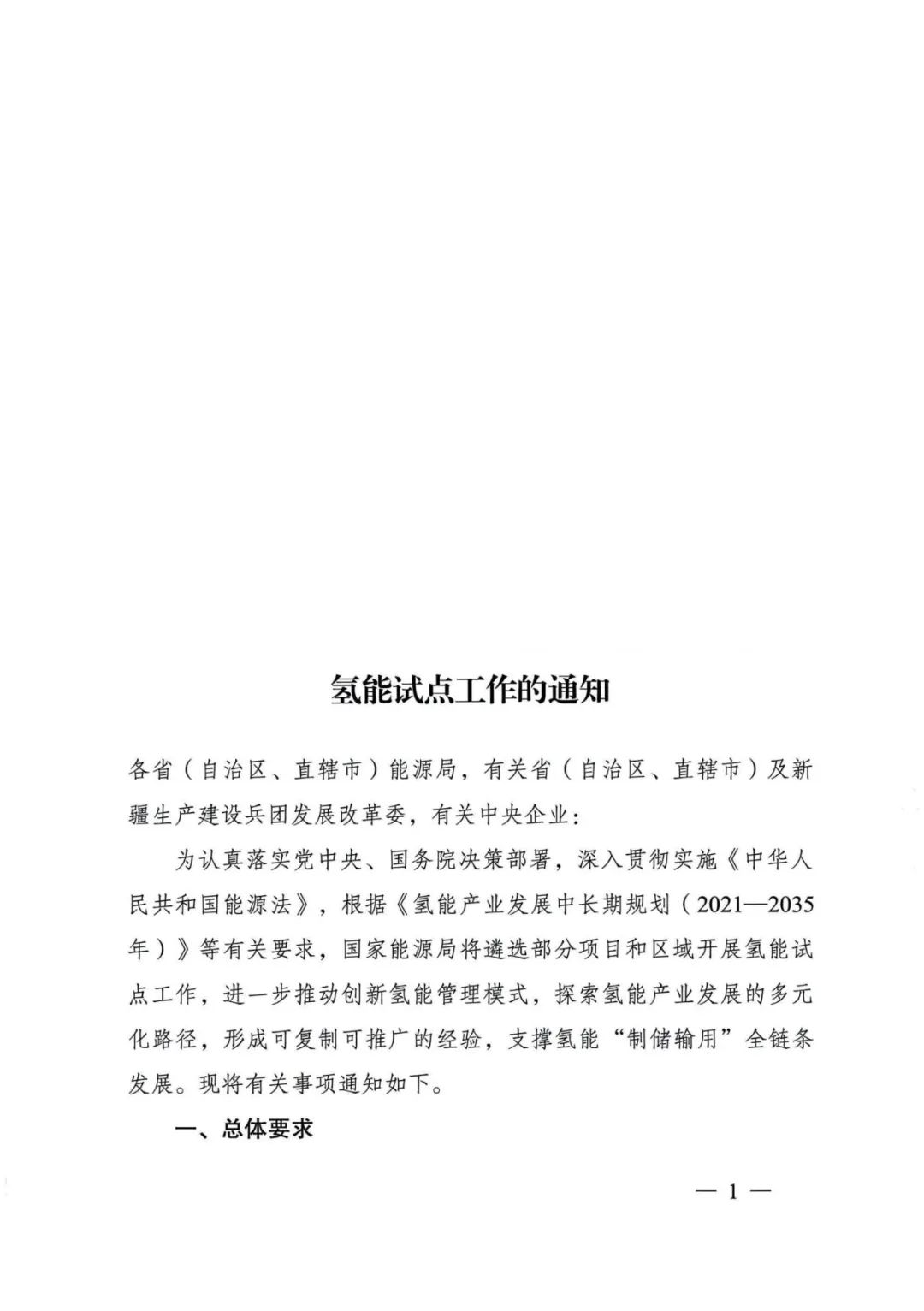 根據(jù)《關(guān)于組織開(kāi)展能源領(lǐng)域氫能試點(diǎn)工作的通知》,文件指出: