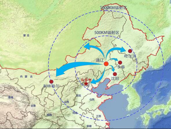 通遼市位于內蒙古自治區東部,北部為大興安嶺南麓余脈的丘陵山地,南部為遼西山地邊緣的淺山丘陵,中部為西遼河沖積平原,平均海拔120~400米,總面積5.95萬平方公里,氣候屬中溫帶大陸性季風氣候,四季分明,年均氣溫0-6℃,年降水量350~400毫米,冬季受西伯利亞冷空氣影響更直接,低溫持續時間更長,有利于自然冷卻系統的穩定運行。地處環渤海經濟圈、東北經濟區和東北亞三角經濟區,是東北與華北的交匯中心,東與吉林省接壤,南與遼寧省毗鄰,西與赤峰市、錫林郭勒盟交界,北與興安盟相連,其周邊800千米范圍內有15個百萬人口以上城市,距離出海口錦州港僅400千米,距離沈陽市、長春市約300千米。通遼市是國家“一帶一路”倡議向北開放的重要戰略節點城市,也是內蒙古距離港口最近的城市,近年來,積極參與共建“一帶一路”和中蒙俄經濟走廊建設,深化與沿邊口岸和沿海港口城市協作,推動保稅物流中心、多式聯運海關監管中心等開放平臺提能增效,跨境電商交易規模持續攀升。