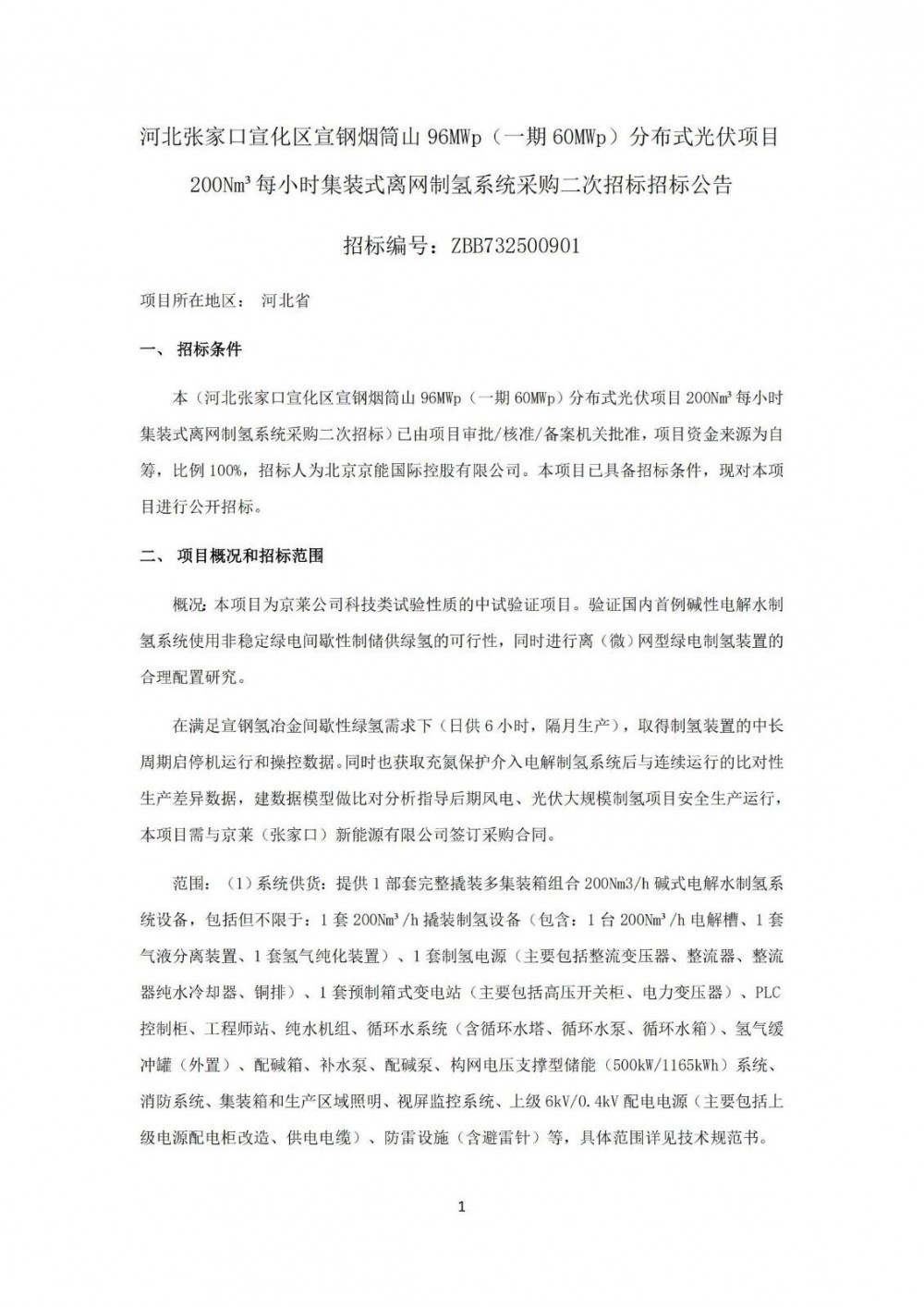 近日,河北張家口宣化區宣鋼煙筒山96MWp(一期60MWp)分布式光伏項目200Nm3每小時集裝式離網制氫系統采購二次招標招標公告。