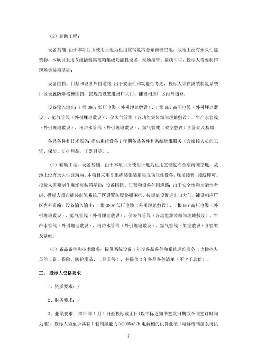 范圍:(1)系統供貨:提供1部套完整撬裝多集裝箱組合200Nm3/h堿式電解水制氫系統設備,包括但不限于:1套200Nm3/h 撬裝制氫設備(包含:1臺200Nm3/h 電解槽、1套氣液分離裝置、1套氫氣純化裝置)、1套制氫電源(主要包括整流變壓器、整流器、整流器純水冷卻器、銅排)、1套預制箱式變電站(主要包括高壓開關柜、電力變壓器)、PLC控制柜、工程師站、純水機組、循環水系統(含循環水塔、循環水泵、循環水箱)、氫氣緩沖罐(外置)、配堿箱、補水泵、配堿泵、構網電壓支撐型儲能(500kW/1165kWh)系統、消防系統、集裝箱和生產區域照明、視屏監控系統、上級 6kV/0.4kV 配電電源(主要包括上級電源配電柜改造、供電電纜)、防雷設施(含避雷針)等。