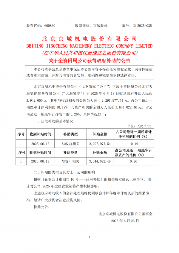 北京京城機電股份有限公司(以下簡稱“公司”)下屬全資附屬公司北京天海氫能裝備有限公司(“天海氫能”)于2025年6月13日收到政府補助人民幣5,942,000元,其中與收益相關(guān)的金額為人民幣2,297,977.54元,占公司最近一期經(jīng)審計凈利潤的10.19%;與資產(chǎn)相關(guān)的金額為人民幣3,644,022.46元,占公司最近一期經(jīng)審計凈資產(chǎn)的0.26%。