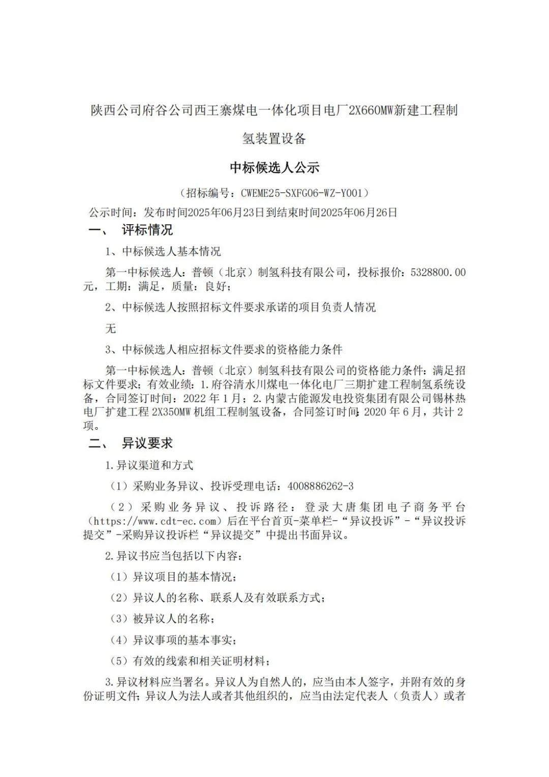 6月23日,陜西公司府谷公司西王寨煤電一體化項目電廠2X660MW新建工程制氫裝置設備中標候選人公示。