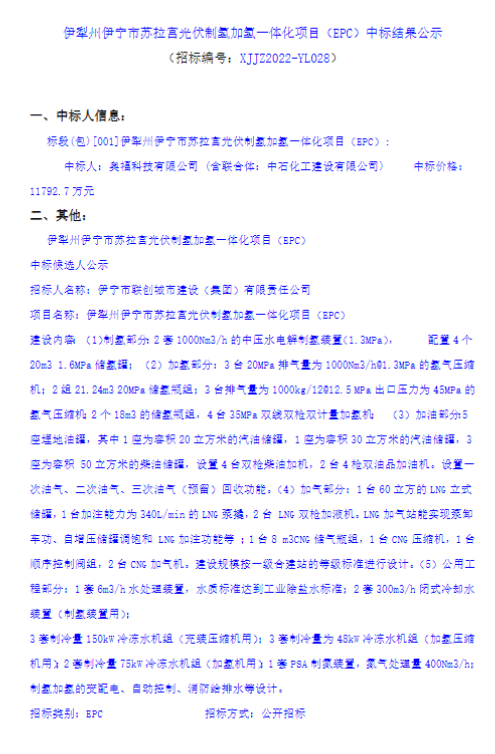近日,伊犁州伊寧市蘇拉宮光伏制氫加氫一體化項(xiàng)目(EPC)中標(biāo)結(jié)果公示,奧福科技有限公司聯(lián)合中石化工建設(shè)有限公司共同中標(biāo),金額為1.17927億元。詳情如下: