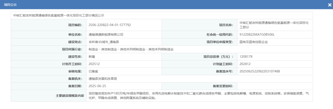 6月25日,吉林省投資項(xiàng)目在線審批監(jiān)管平臺相關(guān)信息顯示,中核匯能吉林能源通榆綠色氫基能源一體化項(xiàng)目化工部分通過備案。