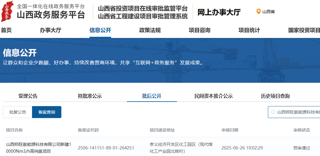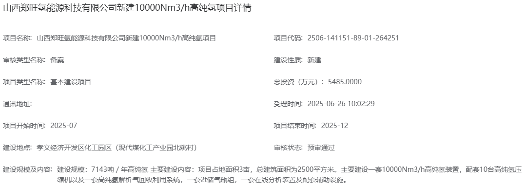 6月26日,山西鄭旺氫能源科技有限公司新建10000Nm3/h高純氫項目備案預審通過。
