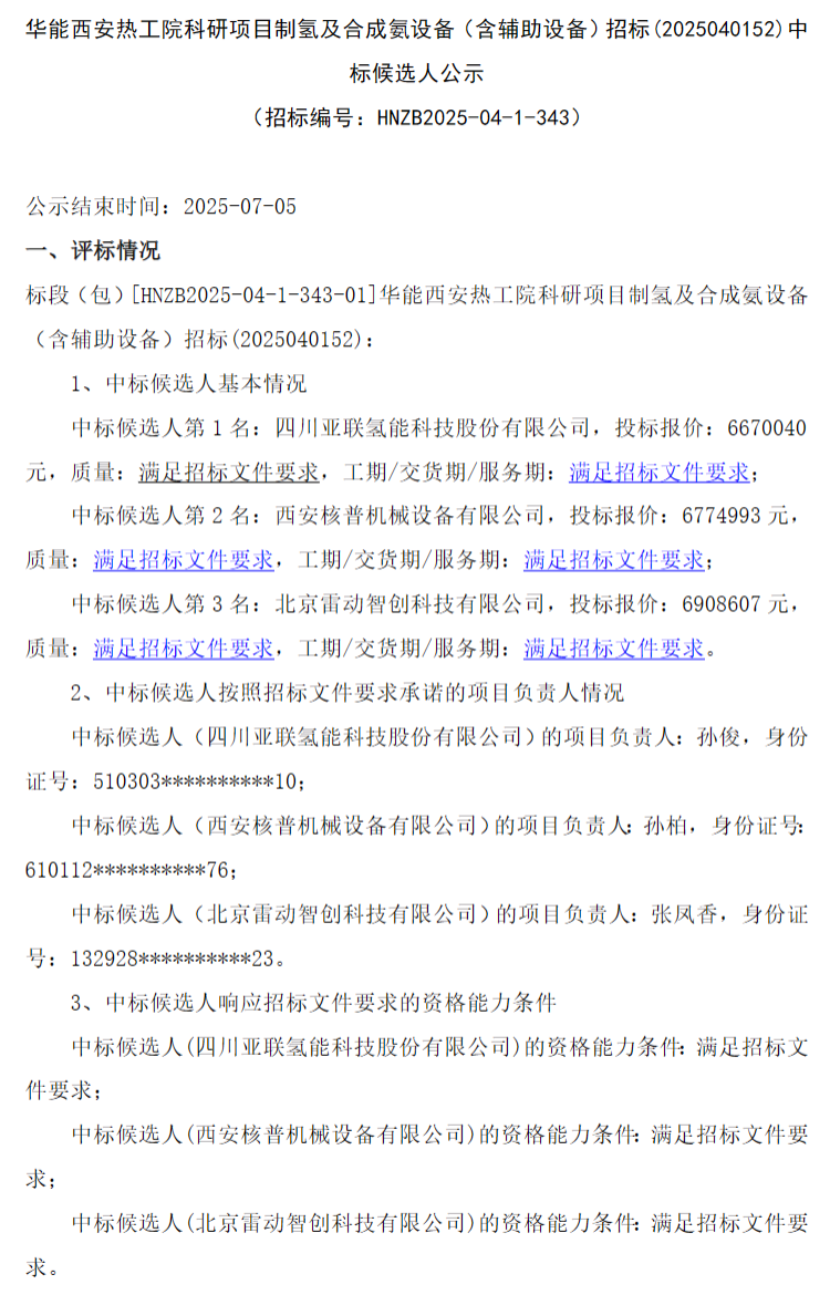 7月2日,華能西安熱工院科研項目制氫及合成氨設(shè)備(含輔助設(shè)備)招標(2025040152)]候選人公示。