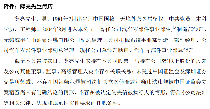 薛亮先生,男,1981年7月出生,中國國籍,無境外永久居留權,中共黨員,本科學歷,工程師。2004年8月進入本公司。曾任公司汽車零部件事業部生產制造部經理、無錫威孚馬山油泵油嘴有限公司副總經理、公司機械系統事業部制造一部副經理、公司汽車零部件事業部副總經理。現任公司總經理助理、汽車零部件事業部總經理。