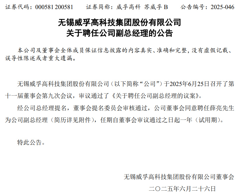 公告稱,威孚高科于2025年6月25日召開了第十一屆董事會第九次會議,審議通過了《關于聘任公司副總經理的議案》。 經公司總經理提名,董事會提名委員會審核通過,公司董事會同意聘任薛亮先生為公司副總經理,任期自董事會審議通過之日起一年(試用期)。
