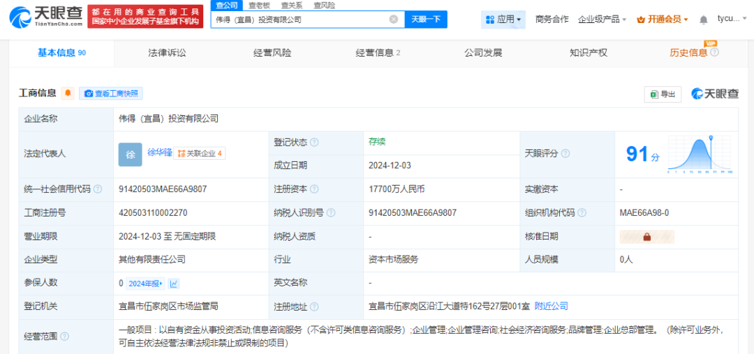 公開信息顯示,偉得 (宜昌) 投資有限公司成立于2024年,注冊資本17700萬人民幣,偉得企業管理咨詢有限公司成員,是一家以從事資本市場服務為主的企業。