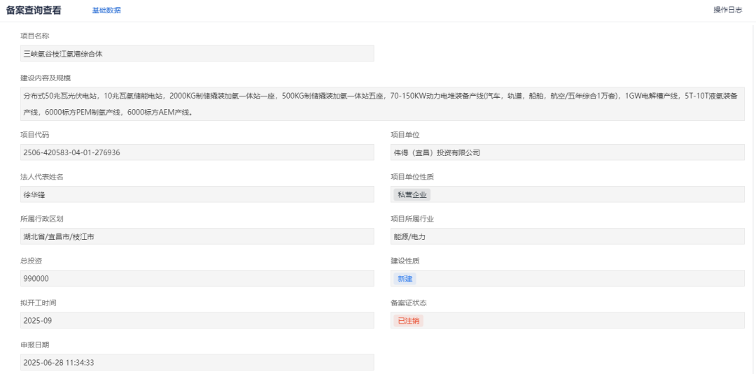 據湖北政務服務網消息,6月28日申報的三峽氫谷枝江氫港綜合體項目(2506-420583-04-01-276936),備案證狀態為“已注銷”。