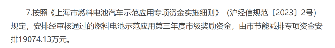 在燃料電池汽車(chē)示范城市群方面,按照《上海市燃料電池汽車(chē)示范應(yīng)用專(zhuān)項(xiàng)資金實(shí)施細(xì)則》(滬經(jīng)信規(guī)范〔2023〕2號(hào))規(guī)定,安排經(jīng)審核通過(guò)的燃料電池示范應(yīng)用第三年度市級(jí)獎(jiǎng)勵(lì)資金,由市節(jié)能減排專(zhuān)項(xiàng)資金安排19074.13萬(wàn)元。