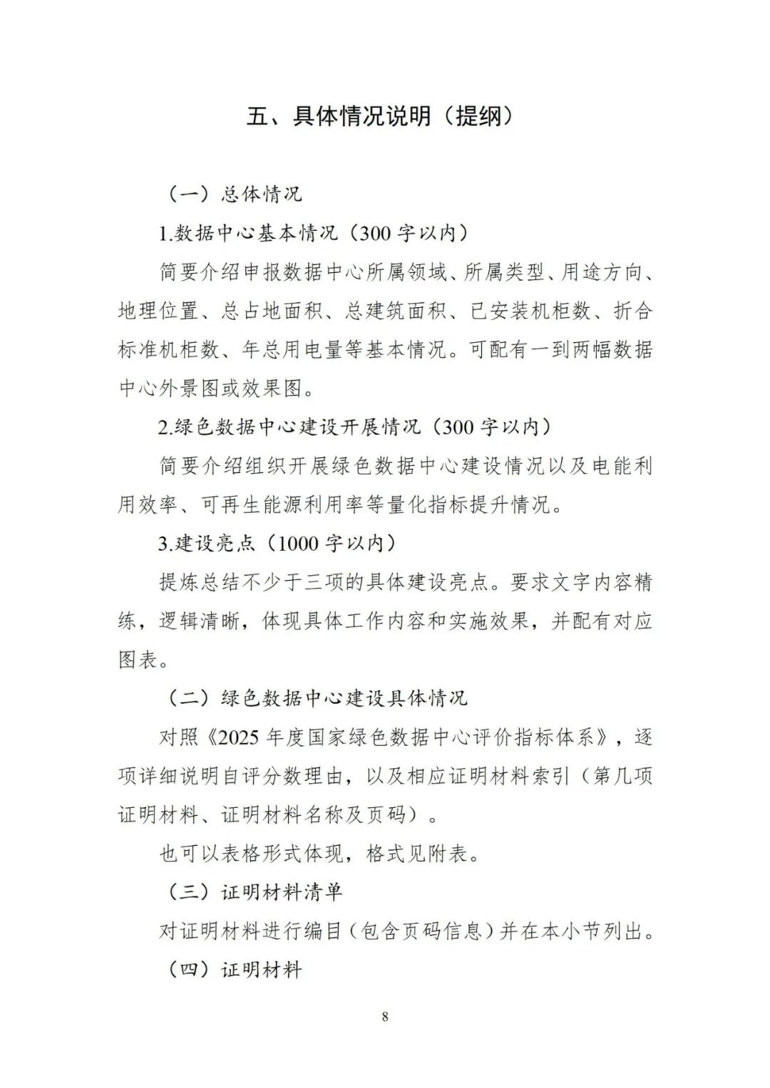 (一)相關(guān)單位自愿參與,對(duì)照《2025年度國家綠色數(shù)據(jù)中心評(píng)價(jià)指標(biāo)體系》及相關(guān)要求開展創(chuàng)建和自評(píng)價(jià),并編制《2025年度國家綠色數(shù)據(jù)中心自評(píng)價(jià)報(bào)告》(附件2)。申報(bào)單位需對(duì)所提供全部材料的準(zhǔn)確性、真實(shí)性負(fù)責(zé)。