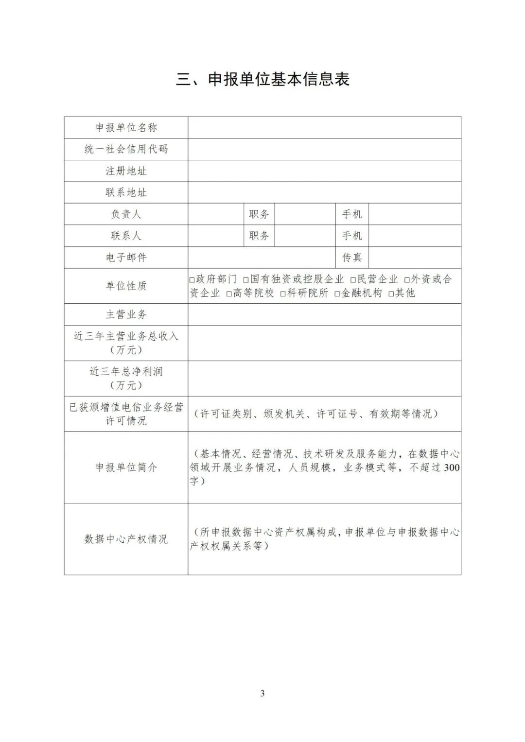 (二)省級(jí)工業(yè)和信息化主管部門會(huì)同發(fā)展改革委、商務(wù)主管部門、能源部門及通信管理局負(fù)責(zé)組織本地區(qū)推薦工作,對(duì)申報(bào)單位的材料完整性、真實(shí)性進(jìn)行審核,并擇優(yōu)推薦至工業(yè)和信息化部(推薦匯總表見附件3)。中國電信集團(tuán)有限公司、中國移動(dòng)通信集團(tuán)有限公司、中國聯(lián)合網(wǎng)絡(luò)通信集團(tuán)有限公司、中國廣播電視網(wǎng)絡(luò)集團(tuán)有限公司所屬數(shù)據(jù)中心由集團(tuán)公司擇優(yōu)推薦至工業(yè)和信息化部。