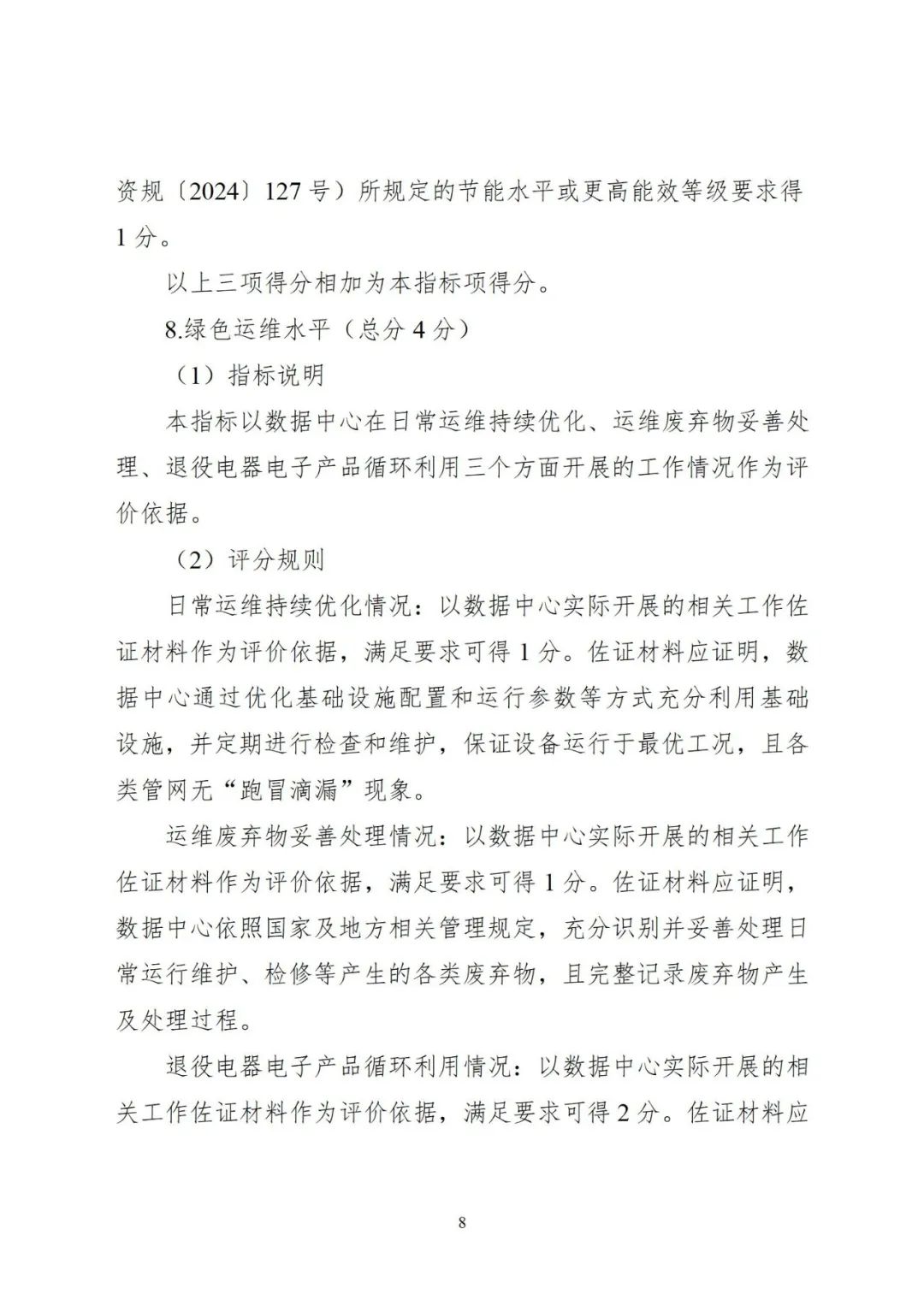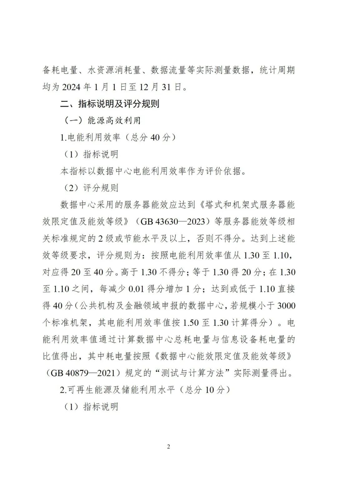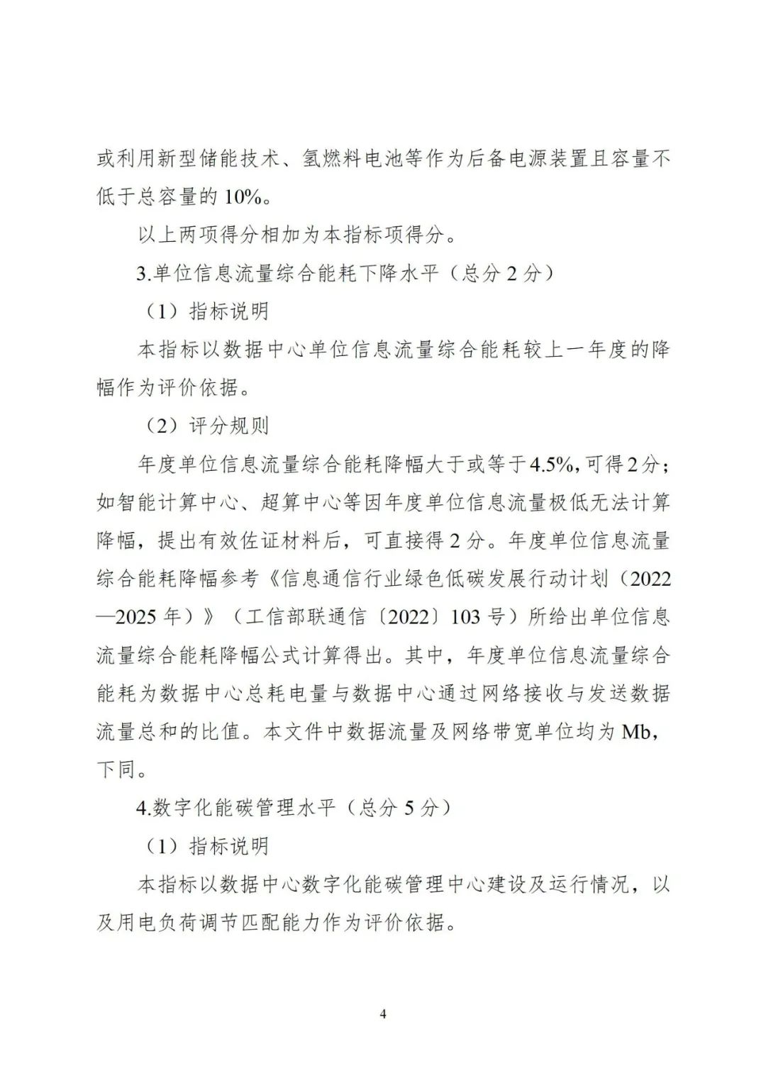 (四)數(shù)據(jù)中心原則上應(yīng)達(dá)到《綠色數(shù)據(jù)中心評(píng)價(jià)》(GB/T 44989—2024)二級(jí)及以上等級(jí)。電能利用效率不高于1.30,達(dá)到《數(shù)據(jù)中心能效限定值及能效等級(jí)》(GB40879—2021)中的2級(jí)及以上水平。采用的服務(wù)器能效應(yīng)達(dá)到《塔式和機(jī)架式服務(wù)器能效限定值及能效等級(jí)》(GB 43630—2023)等規(guī)定的節(jié)能水平及以上。風(fēng)電、光伏等可再生能源利用率不低于數(shù)據(jù)中心所在省(區(qū)、市)可再生能源電力消納責(zé)任權(quán)重,積極利用儲(chǔ)能、氫能等技術(shù),具有較強(qiáng)用電負(fù)荷調(diào)節(jié)匹配能力。