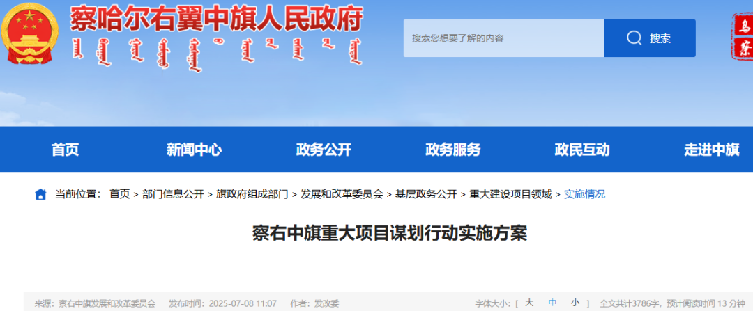 7月8日,察右中旗發展和改革委員會發布《察右中旗重大項目謀劃行動實施方案》。