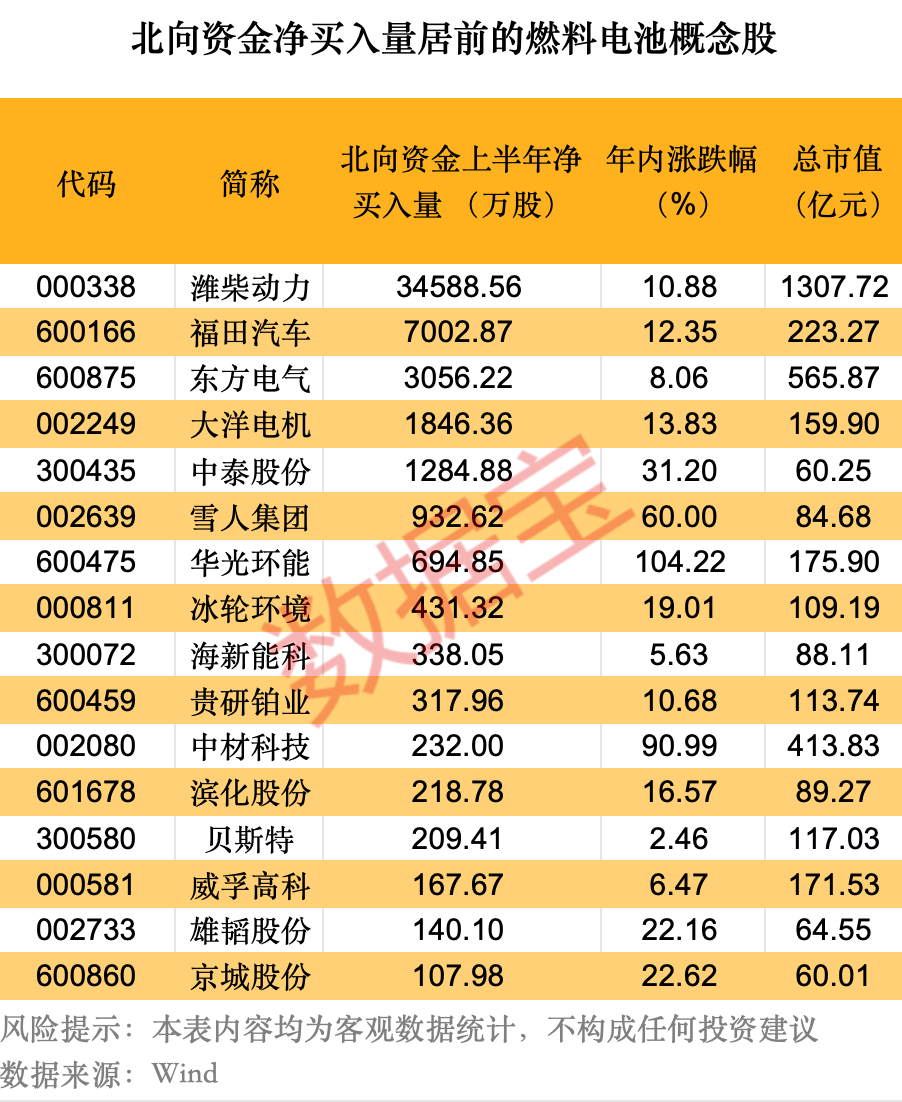 從北向資金凈買入量來看,據數據寶統計,截至二季度末,有16只概念股獲北向資金凈買入量均超百萬股,濰柴動力凈買入達到3.46億股,排在首位;福田汽車、東方電氣、大洋機電、中泰股份等凈買入量均超1000萬股。