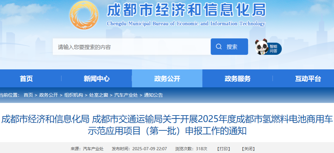 近日,成都市經濟和信息化局 成都市交通運輸局發布《關于開展2025年度成都市氫燃料電池商用車示范應用項目(第一批)申報工作的通知》。