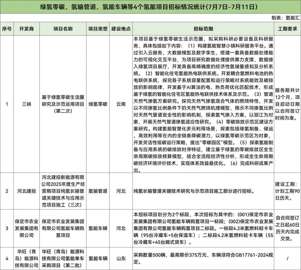 據統計,本周綠氫零碳、氫輸管道、氫能車輛等招標市場方面,共4個項目啟動采購,招標人分別是三峽、河北建投、保定市農業發展集團有限公司、華旺(青島)能源科技有限公司。